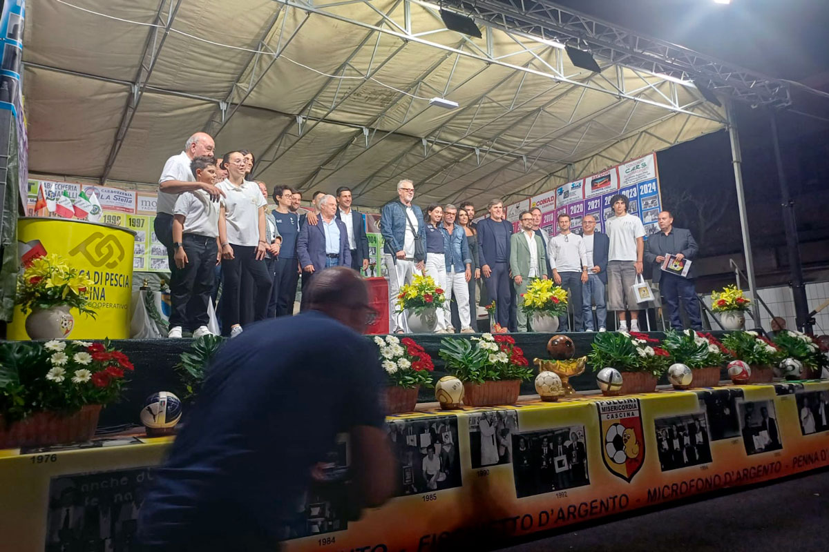 Le stelle dello sport praticato in campo o in panchina, diretto a livello arbitrale, vissuto come dirigente o raccontato sulla carta, in radio, in tv e sul web in passerella lunedì 1 settembre in piazza della chiesa a Cascina per l’edizione numero 50 del Pulcino d’Argento e la seconda del premio “Lealtà allo sport” intitolato alla memoria di Gigi Simoni. Organizzata dal 1975 dalla Polisportiva Pulcini Misericordia Cascina e dal suo factotum Roberto Fiorentini _ omaggiato con il Pulcino d’oro, consegnatogli dal Governatore della Misericordia di Cascina, Emilio Paganelli e con una targa-ricordo dal sindaco di Cascina, Michelangelo Betti _ la manifestazione dei 50 anni è stata un’edizione ripresa integralmente e in diretta sull’emittente Tv Canale 50 e presentata dall’ottima Eva Marcello (50Canale) con lo speaker del Pisa Marco Guidi (Punto Radio). Dopo la vittoria nella prima edizione di Gianluca Pagliuca una delle colonne dell’Inter di Ronaldo che mister Simoni portò alla conquista della Coppa Uefa, primo trofeo dell’era di Massimo Moratti, e che aveva con il tecnico di Crevalcore una perfetta sintonia di vedute e un rapporto di stima e affetto stavolta l’importante riconoscimento è andato a una giovane promessa toscana del calcio: Lorenzo Tosto, classe 2006, difensore centrale dell’Empoli e che, nella scorsa stagione, ha debuttato in serie A nella vittoriosa trasferta degli azzurri in casa della Juventus nei quarti di finale della Coppa Italia. Una decisione ponderata quella che ha visto trionfare Tosto perché Gigi Simoni _ l’unico tecnico italiano capace di di vincere sette campionati di serie B (record assoluto di ogni epoca quasi impossibile da eguagliare) _ credeva molto nei giovani e ne ha lanciati centinaia in serie A e tra questi un futuro campione del Mondo come Alberto Gilardino quando il tecnico originario di Crevalcore guidava il Piacenza. A premiare Lorenzo Tosto _ figlio di Vittorio, ex calciatore di Empoli, Fiorentina, Salernitana, Piacenza, Avellino, Sampdoria, Ascoli, Napoli e altre compagini disputando 500 partite tra a A e B, e che aveva avuto Gigi Simoni come tecnico a Napoli nella stagione 2003-04 _ è stato proprio Leonardo Simoni, il figlio del mister e oggi osservatore della prima squadra dell’Inter e che gode di stima e fiducia incondizionata da parte del tandem Marotta-Ausilio, a consegnare il trofeo a Lorenzo Tosto che aveva già visto giocare in nazionale giovanile. “Mio padre ha sempre avuto un occhio di riguardo per i giovani e sarebbe stato felicissimo di vedere che un premio che porta il suo nome è andato a una promessa del futuro. Oltretutto tra mio padre e Vittorio, babbo di Lorenzo, c’è sempre stato un bel feeling anche dopo la parentesi di Napoli. C’era gande affetto e stima e hanno avuto modo di rivedersi in più di un’occasione. Auguro a Lorenzo che questo premio gli porti fortuna e sia soltanto il primo di una lunga serie di una carriera luminosa”.